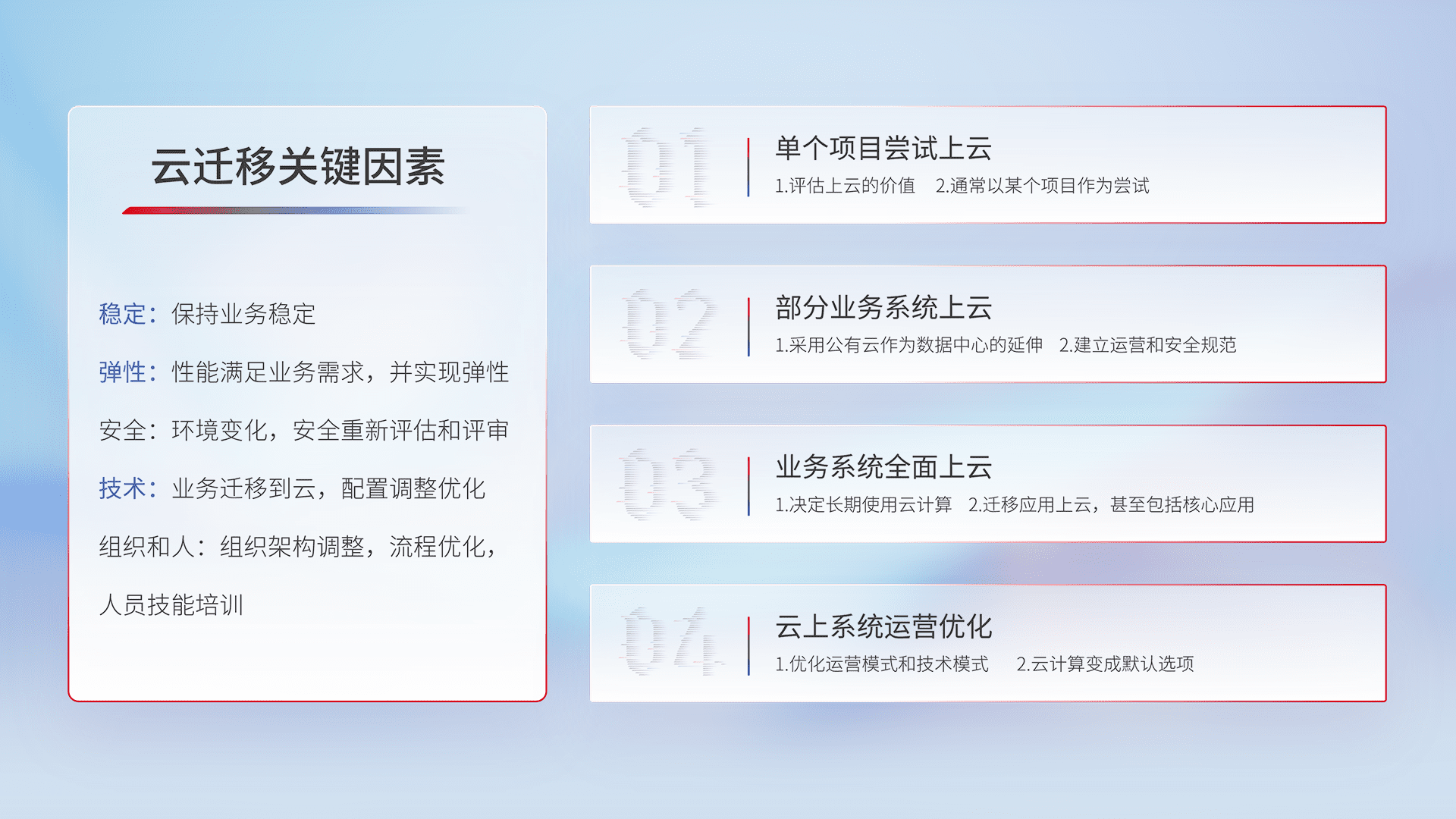 结合实际业务,,,,从规划设计、、云平台选型、、、云原生改造、、、数据迁移、、、、集成交付,,,迁移全过程为客户识别最佳上云路径,,,做好风险识别管理,,设计网络架构、、、身份权限、、、安全审计合规、、、操作审计、、、、日志审计、、监控告警策略、、多站点容灾设计等,,对云上基础设施进行整体规划,,,,提升IT治理水平,,,,以满足弹性、、、、高可用、、高性能的需求。。