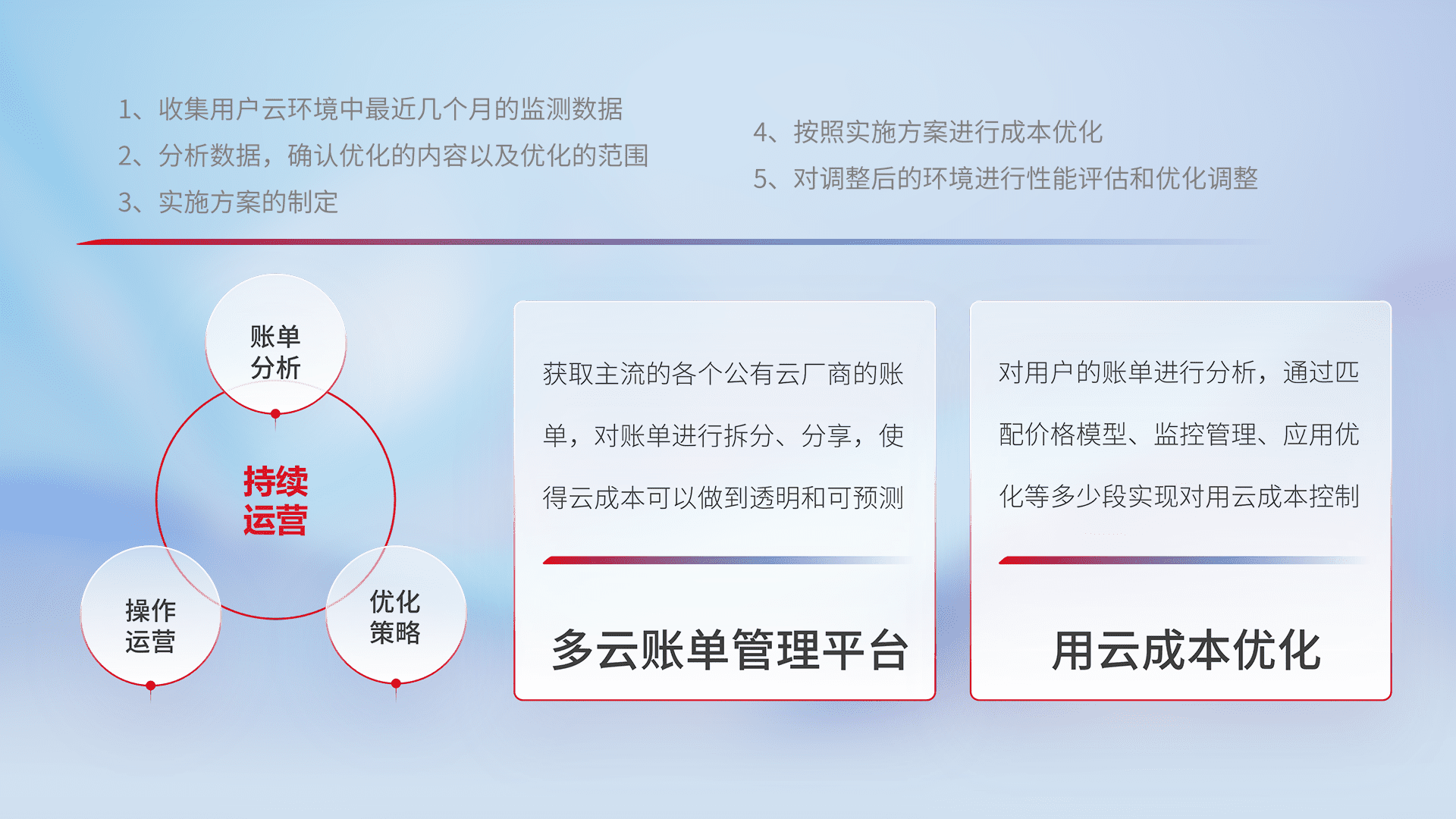 通过多云纳管,,,,以统一的资源数据模型把客户的云资源进行抽象和封装,,进而实现对多云资源的统一操作,,保障云资源管理的可靠性、、稳定性与可用性。。。量身定制化运维内容,,,,配置、、、开发运维、、、补丁管理、、、、备份、、、监控、、认证和访问管理、、审计和日常巡检等,,保障在用云过程中的可靠度,,稳定度以及高可用率。。。